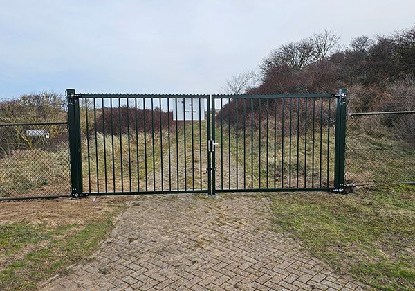 Door de zware omstandigheden in de duinen en de zeelucht was de bestaande dubbele draaipoort volledig doorgeroest. We hebben een nieuwe dubbele draaipoort geplaatst met duplex bescherming (thermisch verzinkt + en dubbele poedercoating) voor maximale corrosiebestendigheid en een langere levensduur. De poort is uitgevoerd met RVS-scharnieren en sluitwerk, passend afgesteld op windbelasting, en netjes opgebouwd met nieuwe aanslagen en fundaties. Hierdoor is de toegang weer duurzaam, veilig en representatief.